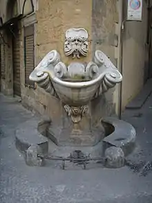 The fountain, located at the acute angle (sprone) formed by the intersection of the two streets, nestled against the private building, was designed and sculpted by Bernardo Buontalenti and completed in 1608, likely for the celebration of the wedding of Cosimo II de' Medici and Maria Maddalena d'Austria.[1] The fountain consists of a grotesque bearded face with a water spout protruding from its mouth, with a swirling marble conch basin below. It has undergone various restorations: in the 17th century by Giuseppe del Rosso, and a recent restoration in 2014.[2]
