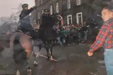 Here the police finally managed to restore order and escorted the mobs to the stadium where both gangs had tickets for the same section. The violence erupted once again at the bottom of the terracing as the Hibs and Aberdeen boys set about their task once again while the police resorted to climbing over the perimeter fence in order to intervene and they eventually managed to keep the rivals apart for the remainder of the match. After the game the CCS clashed with English hooligans near to Mount Florida station and also on Jamaica Street Bridge.[8]