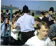 Upon exiting Wembley Way tube station the Hibs casuals clashed with hooligans from Leeds United and the hostilities resumed inside the stadium in sections N and O. The fighting initiated in the upper tier between some CCS and their English counterparts and as the police restored order here the section below this saw battling recommence as casuals from Hibs and other Scottish clubs took on the English crews. This prompted the Hibs boys to drop down and join in with their compatriots in the melee. As the police intervened and made arrests some Hibs boys fought with them on the trackside of the pitch in attempts to rescue members of their crew.[37] After the game there was a brief skirmish between thugs from both countries in a car-park near to the ground and Hibs boys coming to the rescue of some Tartan Army in central London by attacking a group of Portsmouth 6:57 Crew.[2]