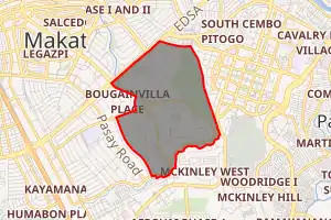 The subdivision is divided into Forbes Park North and Forbes Park South by McKinley Road[1] and is bounded roughly by Epifanio de los Santos Avenue to the northwest, Taguig (Fort Bonifacio which includes Bonifacio Global City) to the east, the Maricaban Creek to the south and southeast, and Acacia Avenue/Dasmariñas Village to the west.