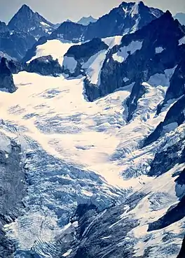 Forbidden Glacier is on the north slopes of Forbidden Peak, North Cascades National Park in the U.S. state of Washington.[2] The glacier is approximately .75 mi (1.21 km) in length, 1 mi (1.6 km) in width at its terminus and descends from 8,000 to 5,600 ft (2,400 to 1,700 m). The glacier is separated by an arête from Boston Glacier to the east and south. Meltwaters from Forbidden Glacier flow into Moraine Lake.