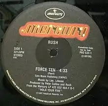 "Force Ten" was released in the United States by Mercury Records as a 12" vinyl one-track promotional single in 1987.[1] It is the opening track of Rush's studio album Hold Your Fire, and the song later appear on compilation albums such as Chronicles, Retrospective II, The Spirit of Radio: Greatest Hits 1974-1987, Gold, Icon, and Sector 3.[10] It was performed live from the Hold Your Fire Tour through the Test for Echo Tour, then later on the R30 Tour and Clockwork Angels Tour. The song received a favorable critical reception, with Allmusic calling it "the band's [Rush] most immediate number in years," rating the song an AMG pick track.[11] The song would make it on the Billboard Hot Mainstream Rock Tracks, peaking #3.[12]