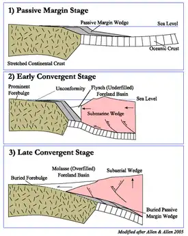 The plate tectonic evolution of a peripheral foreland basin involves three general stages. First, the passive margin stage with orogenic loading of previously stretched continental margin during the early stages of convergence. Second, the "early convergence stage defined by deep water conditions", and lastly a "later convergent stage during which a subaerial wedge is flanked with terrestrial or shallow marine foreland basins" (Allen & Allen 2005).