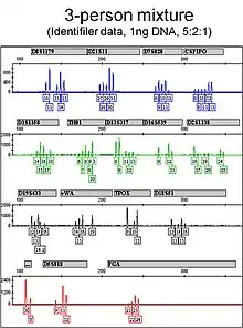 As mentioned, the main advantage of using mtDNA is its high copy number. However, there are a few disadvantages of using mtDNA as opposed to nuclear DNA. Since mtDNA is inherited maternally and passed to each offspring, all members of the maternal familial line will share a haplotype.[12] A haplotype "is a group of alleles in an organism that are inherited together from a single parent". The sharing of this haplotype among family members can cause an issue in forensic samples because these samples are often mixtures that contain more than one DNA contributor.[11] Deconvolution and interpretation of mtDNA mixtures is more difficult than that of nuclear DNA and some laboratories choose not to attempt the process[13] Since mtDNA does not recombine, the genetic markers are not as diverse as autosomal STRs are in the case of nuclear DNA.[12] Another issue is that of heteroplasmy. Heteroplasmy is when an individual has more than one type of mtDNA in their cells.[11] This can cause an issue in the interpretation of data from questioned forensic samples and known samples that contain mtDNA.[14] Having adequate knowledge and understanding of heteroplasmy can help ensure successful interpretation.[14]