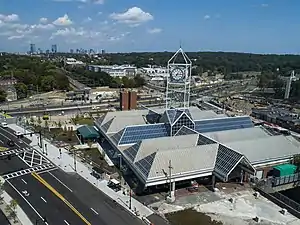 A bicycle cage – the first MBTA "Pedal and Park" cage in Boston – opened at Forest Hills on September 28, 2009.[19] Work performed as part of the Casey Overpass removal, which began in 2015, involved a rebuilt upper busway and a second Orange Line headhouse.[20] The canopy was constructed as a $11 million change order to the Arborway project.[21] The never-used Green Line loops and waiting area near the north entrance to Forest Hills were demolished.[22] The headhouse opened on November 6, 2019.[21]