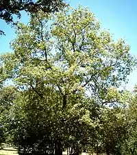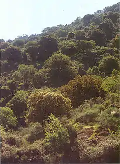 The vegetation is deciduous oak forest: both sessile oaks (Quercus petraea)[1] and pedunculate oaks (Quercus robur), with European ash (Fraxinus excelsior) and hazels in the coolest and deepest soil at the bottom of the valley. The mountain layer is characterised by the presence of beeches and at times, in the Pyrenees, by silver firs (Abies alba); these beeches and silver firs occupy the cool slopes with shallow soil. The Mediterranean influence is felt in the presence of Holm oaks (Quercus rotundifolia) with bay laurel, which are situated on the warmest crests and slopes, especially above chalky soil, where the dryness becomes more pronounced.