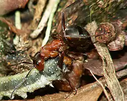 These ants' primary diet is aphid honeydew, but they also prey on invertebrates such as insects and arachnids;[3] they are voracious scavengers. Foraging trails may extend 100 m.[3] Larger workers have been observed to forage farther away from the nest.[6] F. rufa commonly is used in forestry and often is introduced into an area as a form of pest management.