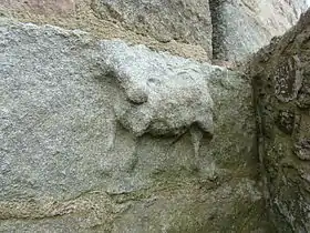 Four sculptures representing the tetramorph according to Ezekiel are found at the level of the yellow granite circle which surrounds the keep. Here, facing the castle, can be found the angel of Saint Matthew, then the lion of Saint Mark, the eagle of Saint John (severely eroded) and finally the bull of Saint Luke to the right of the entrance to the keep .