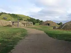On-A-Slant Mandan Village (Mandan: Miti-ba-wa-esh) was established in the late 16th century and was inhabited until c. 1781. During those years the Mandan tribe had between seven and nine villages (all located along the Missouri River), with an estimated total population of 10,000 to 15,000. On-a-Slant was the furthest south of all these villages and consisted of approximately 86 earth lodges. Its population was about 1,000–1,500. It was located near the point where the Heart River and the Missouri River come together and was named so by the Mandan because the village was built on ground that slopes towards the river valley. It was fortified with a ditch and palisade, to protect its wealth of food and trade goods.[11]