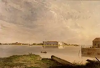 During the War of 1812, efforts were made to fortify Pea Patch Island. This plan of defense was largely coordinated by Capt. Samuel Babcock, who was working nearby on similar defenses in Philadelphia. During this time a seawall and dykes were built around the island. There is no known evidence that any progress was made on the actual fortification by war's end. The original plan was to build a Martello tower on the island.[1] One source states that an earthwork fort was built on the island during the war and torn down in 1821; also, a wooden fort existed from 1814 to 1824.[6]