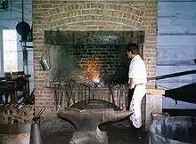 The gunpowder magazine is the only original building in the fort. Reconstructed buildings in the fort include the four blockhouses, a single storey officers' kitchen, a single-storey rectangular officers' quarters built in a Colonial Revival-style, and a rectangular guardhouse with a gabled roof clad in cedar shakes.[32][33][34] All the reconstructed buildings are loose interpretation of the original structures, with the designs based on the architect's interpretation of a frontier fort.[32][33][34] As a result, the historical designation is confined to the footprint of the buildings.[32][33][34] The fort's artificer's and blacksmith shop, was also constructed during the 1930s reconstruction of the fort, although the building itself is not based on any historical antecedent.[35] The building is used as a modern workshop, although it was designed in the same aesthetic as the other reconstructed buildings.[35]