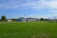 In addition to the fort, Fort George National Historic Site also contains Navy Hall, a reconstructed historical building below the eastern ramparts of the fort at the shoreline of the Niagara River.[47] The original Navy Hall predates the construction of the original Fort George, with the building having served as the barracks for the Provincial Marine, and the larger area being used as a shipyard and supply depot for Fort Niagara.[48] During the late 1780s and early 1790s, the building was intermittently used by the lieutenant governor of Upper Canada, John Graves Simcoe as a private residence.[49] Simcoe's offices were made into an officers' mess for soldiers in Fort George; while the rest of the building was used as storage for the Provincial Marines.[49] An American artillery barrage in November 1812 led to the destruction of the original Navy Hall.[50]