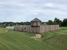 The ramparts of the fort were made up of irregular earthworks consisting of six bastions, each framed with timber and connected by a line of picketing.[45] The earthworks were bulldozed into place during the 1930s.[27] As opposed to the present earthworks, which were largely bulldozed in place, the original fort's earthworks were built using wooden cribs over the ravine gully, and using inundated clay to stabilize the soil.[27] Because bulldozers were used for the earthworks reconstruction, only the area around the two northern bastions have a resemblance with the original fort's configuration.[27]