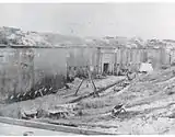 During the Battle of Mobile Bay on August 5, 1864, Union naval forces under Admiral David G. Farragut[6] were able to get past Fort Morgan and enter the Bay. They captured Tennessee and Selma, forced the beaching and burning of Gaines, and captured Fort Gaines. This freed the Union land forces under Gordon Granger to besiege Fort Morgan.[6] After two weeks of bombardment from sea and land, Major Richard L. Page, commander of the fort, felt compelled to surrender, which he did on August 23, 1864,[6] after first spiking the fort's guns.[7] During the siege, the wooden roof of the Citadel, a ten-sided barracks located in the center of the fort used to house the enlisted men, caught fire and the structure was badly damaged.[6] Rather than restore it, post-War crews used the ruins as a brick source for repairing the fort. The remains of the Citadel were razed in the 1880s for use as a breakwater.[8]
