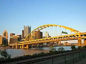 The $6.305 million Fort Pitt Bridge, designed by George S. Richardson of Richardson, Gordon, & Associates, opened at 11 a.m. on June 19, 1959 with a ribbon-cutting ceremony by Gov. David L. Lawrence before a caravan, including Mayor Thomas Gallagher and mayoral candidate Joseph M. Barr, was driven across while a city fireboat gave a hose salute upriver.[3] Its two predecessor bridges, the original Point Bridge (1877–1924) and its replacement of the same name (aka Point Bridge II, 1927–1959), spanned even closer to the aforementioned confluence from West Carson Street (near the Duquesne Incline) to Water St. (now Fort Pitt Blvd.), near the tip of Point State Park. The Point Bridge closed two days after the opening of the Fort Pitt Bridge, but remained standing until it was dismantled (along with the connected Manchester Bridge) in 1970.