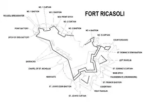 Fort Ricasoli has an irregular plan following the coastline of the peninsula it is built upon. The fort consists of a bastioned land front and its outworks, an enceinte facing the sea, and a tenaille trace facing Rinella Bay of the Grand Harbour.