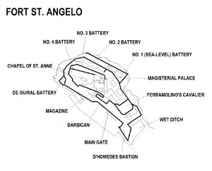 34. "No. 2. Battery – Fort St Angelo" (PDF). National Inventory of the Cultural Property of the Maltese Islands. 28 June 2013. Retrieved 13 July 2015.
