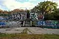 Beginning in the early 20th century, the seven major concrete gun batteries listed below were built and armed at Fort Wetherill.[7] During World War II, Anti-Motor Torpedo Boat (AMTB) Battery 923 was built, consisting of two fixed 90 mm guns plus two mobile 90 mm guns on platforms that remained from an earlier antiaircraft gun battery, along with two 37 mm guns. This battery was previously at Brenton Point in Newport until July 1944.[8] Battery 924, with two 90 mm guns on mobile mounts, was also at the fort.[9] Only Batteries Dickenson and Crittenden (plus the AMTB battery) were operational during World War II.[10] New batteries at Fort Church and Fort Greene included 16-inch guns which superseded most of Fort Wetherill's batteries.