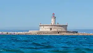 The structure, considered a model of Renaissance fortification, and believed to have been modelled by the architect on Castel Sant'Angelo in Rome, [6] is perfectly circular, in stone masonry. It consists of an external sloping wall 62 meters in diameter and 6 meters high; an internal wall 33 meters in diameter by 7 meters in height, and a central tower, 3 meters in diameter and 16 meters high, at the top of which is the modern lighthouse. Inside the internal wall are a command post, barracks, storage, a cistern and a chapel. [7][3]