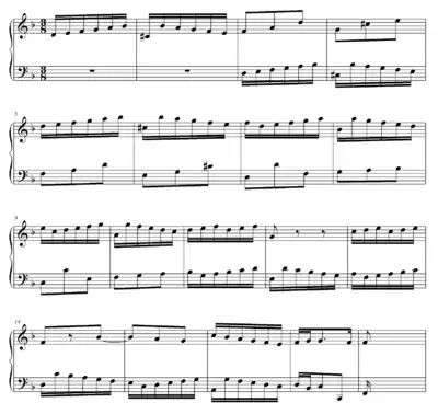 This developmental process and its resulting musical structure are used mainly in the Baroque period. Here is an example of the fortspinnung process in the first section of the Johann Sebastian Bach Invention No. 4 in D minor (BWV 775):[3]