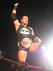 With Styles' recent shortcomings, Flair adopted X Division standout Kazarian as his newest protégé on the May 27 episode of Impact!, much to Styles' dismay.[11][12] On the June 17 episode of Impact!, Flair announced that he would reform the legendary stable Four Horsemen under the new name Fourtune (though not legally permitted to use the Four Horsemen moniker due to WWE's ownership) and compared Styles to his former Four Horsemen partner Arn Anderson, Kazarian to Barry Windham, Roode and Storm to Ole Anderson and Tully Blanchard and Wolfe to Lex Luger, while also stating that each of them would have to earn their spots in the group.[3] Flair, wanting peace between Styles and Kazarian, booked them in a tag team match against Samoa Joe and TNA Global Champion Rob Terry at Victory Road.[13] The plan seemed to work as Styles and Kazarian worked together and were victorious due to outside interference from Desmond Wolfe and, on the July 15 episode of Impact!, Flair announced that Styles and Kazarian had earned their spots in Fourtune.[14][15] Wolfe confronted Flair and demanded a membership in the group, but was not given one due to his long losing streak.[15] On the July 22 episode of Impact!, Styles defeated Rob Terry to win the Global Championship, after some assistance from Kazarian, and the following week renamed the title the TNA Television Championship.[16][17] That same night Fourtune's lineup was seemingly completed with the addition of Robert Roode and James Storm as the final two members, leaving Desmond Wolfe outside the group.[17]