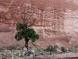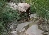The headwaters of Fortymile and Willow Gulches have their origins along a 7-mile (11 km)[1] segment of the Straight Cliffs, the eastern edge of the Kaiparowits Plateau. Intermittent streams merge to form larger branches, then combine to carve a deep canyon up to 500 feet (150 m) into sandstone layers before meeting the main channel of the Escalante River. The northernmost branch is Fortymile Gulch, the historic location of the winter encampment of the San Juan Expedition. Intent on founding a colony in southeastern Utah, they waited at Fortymile Springs in late 1879 while a smaller group prepared a perilous route down to the Colorado River at Hole-in-the-Rock. Nearby is Dance Hall Rock, a scenic dome formed from Entrada sandstone.[2] The lower section of Fortymile Gulch, before it merges with Willow Gulch, is a narrow channel of slot canyons and water pools.