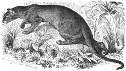 The fossa was formally described by Edward Turner Bennett on the basis of a specimen from Madagascar sent by Charles Telfair in 1833.[8] The common name is the same as the generic name of the Malagasy civet (Fossa fossana), but they are different species. Because of shared physical traits with viverrids, mongooses, and Felidae, its classification has been controversial. Bennett originally placed the fossa as a type of civet in the family Viverridae, a classification that long remained popular among taxonomists. Its compact braincase, large eye sockets, retractable claws, and specialized carnivorous dentition have also led some taxonomists to associate it with the felids.[9] In 1939, William King Gregory and Milo Hellman placed the fossa in its own subfamily within Felidae, the Cryptoproctinae. George Gaylord Simpson placed it back in Viverridae in 1945, still within its own subfamily, yet conceded it had many cat-like characteristics.[4][10]