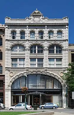 When built in 1907, it was the first building in the city to use terra cotta as its primary siding on the front facade, and the first built under the precepts of the City Beautiful movement. In 1991 it was listed on the National Register of Historic Places. It has since been remodeled into apartments, but has been vacant for a while and is suffering from the neglect.[2] Past water damage will require that the lavishly appointed interior be completely gutted.[3] The regional redevelopment agency is considering acquiring the building through eminent domain in order to ensure its restoration.
