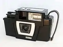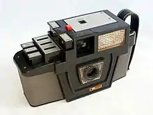 The Fotron was a camera produced by the Traid Corporation of Glendale, California between 1962 and 1971 and mainly sold door to door. It had a highly unorthodox design and boasted several firsts for a consumer camera, including a built-in electronic flash, built-in motor drive, and drop-in film loading (beating Kodak's popular Instamatic to the market).[1] Other unusual features included push-button exposure and focus controls and an integrated rechargeable battery. The camera used standard 828 rollfilm packaged in a proprietary snap-in cartridge which had to be returned to the company for processing. It was aimed mainly at women, marketed as a "goof-proof" alternative to traditional cameras.[2]