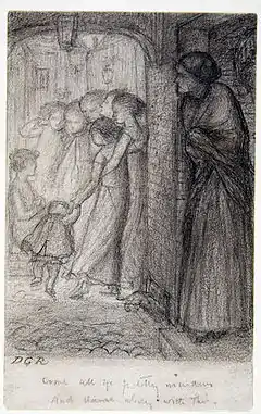 Rossetti had addressed the topic of prostitution as early as 1847 in letters to his friend William Bell Scott, who wrote the poem Rosabell in 1846 (later known as Maryanne) on the topic. The Gate of Memory, a drawing Rossetti made c. 1854, shows a scene from Rosabell where a prostitute is beginning her evening of work, and views a group of innocent girls "still at play" dancing. The drawing may have been intended to illustrate the poem in a book, but was painted as a larger watercolour in 1857, which was repainted in 1864.[4] In 1870 Rossetti published a sympathetic poem about a prostitute, Jenny.