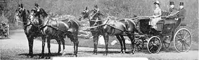 A Four-in-hand is any vehicle drawn by four horses driven by one person.[1] Driving large heavy carriages and private coaches drawn by four horses was a popular sporting activity of the rich after the middle of the 19th century.[2]