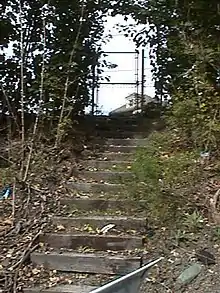 Service on the Fairmount Line (as the Dorchester Branch of the Norfolk County Railroad and later the New York and New England Railroad and New York, New Haven and Hartford Railroad) began in 1855 and lasted until 1944. A station named Mt. Bowdoin was located near the Washington Street overpass.[4] The area around the station was largely developed between 1895 and 1916; a real estate office was located across the street from the station.[5] Originally one story, the small inbound station building was awkwardly modified with a second story below street level when the tracks were lowered to eliminate problematic grade crossings.[6] There was a small shelter on the outbound side; a set of wooden steps leading to the outbound side are still extant.
