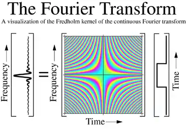 The Fourier operator is the kernel of the Fredholm integral of the first kind that defines the continuous Fourier transform, and is a two-dimensional function when it corresponds to the Fourier transform of one-dimensional functions. It is complex-valued and has a constant (typically unity) magnitude everywhere. When depicted, e.g. for teaching purposes, it may be visualized by its separate real and imaginary parts, or as a colour image using a colour wheel to denote phase.[1][2]