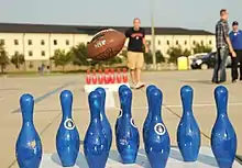 Fowling is a hybrid game that combines the equipment of American football and bowling into one sport with a similar layout as horseshoes and cornhole. Most commonly played as a pastime in a tailgate or campground setting across the United States, Fowling was founded in 2001 by Chris Hutt and a bunch of friends from Detroit, Michigan, tailgating at the Indy 500.[1] The object of Fowling is for teams to be the first to knock down all opponent's pins by throwing a full-size regulation football at 10 bowling pins positioned in a traditional bowling layout.[1]