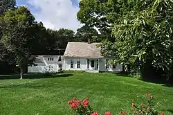 The Fox–Cook Farm stands at the end of Cook Drive, a spur road on the west side of United States Route 7 in southern Wallingford. The farm complex extends along the south side of Cook Drive, between the street and a ravine, with a cluster of outbuildings marking the end of the drive. The house is a 1+1⁄2-story Cape style wood-frame structure, five bays wide, with a gabled roof, central chimney, and rubblestone foundation. It is oriented facing east, with views of the Otter Creek valley. Its entrance is framed by sidelight windows, and sheltered by a flat-roof porch with turned posts. The front windows are elongated in the Greek Revival style. A single-story wing is set back and extending to the main block's left side. The c. 1850 barn is set downslope, to the east of the house, with most of the outbuildings further up the slope behind the house.[2]