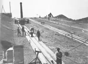 The plane was designed by Gordon Cale Thomas, after a large-scale prototype was built at the company's Bulbourne yard and he had assessed the 75 ft (23 m) climb.[2] It had two tanks, or caissons, each capable of holding two narrowboats or a barge. The caissons were full of water, and so balanced each other. The caissons' vertical guillotine gates created a watertight seal.[2] The lift was powered by a 25-horsepower (19 kW) stationary steam engine. The land for the plane was purchased for £1,595 and total expenses for the project came to £39,244 by 24 June 1900.[3]