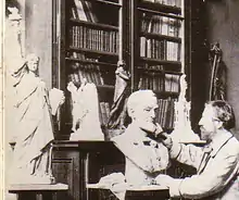 Bartholdi sculpting. To the left is a miniature of Liberty Enlightening the World.
