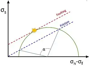 The shear force required to slip fault is less than force required to fracture and create new faults as shown by the Mohr-Coulomb diagram. Since the earth is full of existing cracks and this means for any applied stress, many of these cracks are more likely to slip and redistribute stress than a new crack is to initiate. The Mohr's Diagram shown, provides a visual example. For a given stress state in the earth, if an existing fault or crack exists orientated anywhere from −α/4 to +α/4, this fault will slip before the strength of the rock is reached and a new fault is formed. While the applied stresses may be high enough to form a new fault, existing fracture planes will slip before fracture occurs.