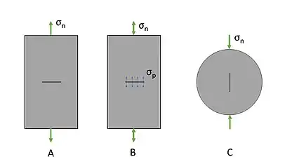 Tensile fracturing may also be induced by applied compressive loads, σn, along an axis such as in a Brazilian disk test.[3] This applied compression force results in longitudinal splitting. In this situation, tiny tensile fractures form parallel to the loading axis while the load also forces any other microfractures closed. To picture this, imagine an envelope, with loading from the top. A load is applied on the top edge, the sides of the envelope open outward, even though nothing was pulling on them. Rapid deposition and compaction can sometimes induce these fractures.