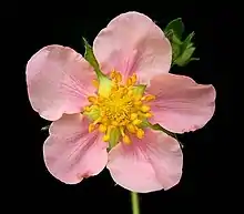 - 'Frel', also known as Pink Panda,[2] is a patented hybrid strawberry that is the result of crossing the garden strawberry Fragaria × ananassa subsp. cuneifolia (syn. Fragaria grandiflora)[3] with Marsh Cinquefoil, Comarum palustre (formerly Potentilla palustris), followed by backcrossing to strawberry.[4] The plant is grown for ornamental purposes. It has bright pink flowers (in contrast to the white flowers of naturally occurring strawberry species) and it produces a small number of strawberries.[4]