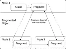 In contrast to distributed objects, they are physically distributed and encapsulate the distribution in the object itself. Parts of the object - named fragments - may exist on different nodes and provide the object's interface. Each client accessing a fragmented object by its unique object identity presumes a local fragment. Fragmented objects may act like a RPC-based infrastructure or a (caching) smart proxy as well. Therefore, clients cannot distinguish between the access of a local object, a local stub or a local fragment. Full transparency is gained by the following characteristics of fragmented objects.