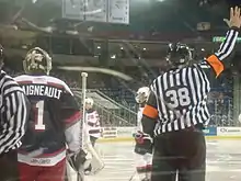 As he began to work games in the QMJHL, St-Laurent was hired by the American Hockey League as a linesman for the 1999–00 AHL season. His first regular-season game in the AHL came on 22 November 1999, as the St. John's Maple Leafs faced off against the Quebec Citadelles.[18] He spent four years working the lines in the AHL before he was hired by the NHL as a referee.[19][lower-alpha 4] While Quebec would be his home base, he would also work games in Ontario (Hamilton Bulldogs),[20] New Brunswick (Saint John Flames),[21] and Newfoundland (St. John's);[22] all three of which came in the 2002–03 AHL season.