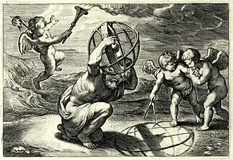In Aguilon's book the beginning of each section had works of the Flemish Baroque painter, Peter Paul Rubens. The frontispiece at the beginning of the book shows an eagle, referring to Aguilon's name and a variety of optical and geometrical images. On either side of the title stands Mercury holding the head of Argus with a hundred eyes, and Minerva holding a shield reflecting the head of Medusa. Then, at the beginning of each of six sections are Rubens' drawings describing Aguilon's experiments, one of which is the first known picture of a photometer[13] This is one of six experiments drawn by Rubens and shows how intensity of light varies with the square of distance from the source. The experiment was later taken up by Mersenne and another Jesuit, Claude de Chales, and eventually led to Bouguer's more famous photometer. It is evident, from the detail that he put into his drawings, how enthused Rubens was about the subject matter, perspective geometry and optical rules.