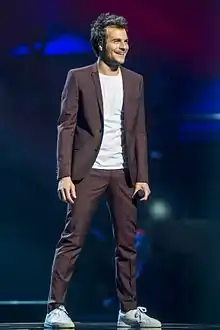The French performance featured Amir on stage alone dressed in a suit with a white shirt.[25][26][27] The stage colours were predominately blue with purple and white lighting and the LED screens displayed planets and a starry galaxy. The stage was lit up in the colours of the French flag at the conclusion of the performance. Amir was joined by four off-stage backing vocalists: Delphine Elbé, Fred D'Angelo, Ivan Pavlak and Lars Hägglund.[28] France placed sixth in the final, scoring 257 points: 109 points from the televoting and 148 points from the juries.[29][30]