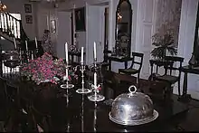The building reflects the owner's interest in French architecture in the triple-arched entrance, enclosed upper balcony, and "sweeping front staircase".[4] The house combines Barbadian coral stone craftsmanship, Demerara windows, and Brazilian wood panelling.[1] It has a collection of antique mahogany furniture and West Indian maps dating back to the early 16th century.[1][4] It is set in terraced English-style gardens, with bougainvillea, hibiscus, and frangipani plants and a large mammee apple tree.[4] It also has orchards.[3] The Barbados National Trust designated it a house of architectural interest.[11]