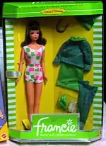Francie Fairchild is a fashion doll issued by Mattel from 1966 to 1976 and re-introduced in 2011. Marketed as "Barbie's MODern cousin" from England, the doll had an extensive line of "mod"-style clothing, often employing bright colors and geometric patterns similar to fashions associated with Carnaby Street in the late 1960s to early 1970s. At 11¼ inches tall, the Francie doll was shorter than Barbie, but taller than Skipper, making the character presumably between the two in age.
