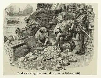 Drake's exploits made him a hero to the English, but his privateering led the Spanish to brand him a pirate, known to them as El Draque.[10] King Philip II of Spain allegedly offered a reward of 20,000 ducats for his capture or death,[11] equivalent to around £6 million (US$8 million) in 2015.[12]
