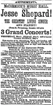Shepard traveled in Europe, finding audiences among royalty, and impressed the French novelist Alexandre Dumas fils. Shepard was described by contemporaries as tall, dark, handsome, and with hands that could reach over an octave on a piano keyboard.[3][6] He became involved with Spiritualism while in Russia in the 1870s and stated that many of his musical performances were the result of the spirits of famous composers channeling through him.[7][8]