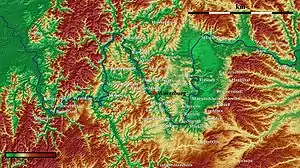 The Mainviereck ("Main square") is the westernmost district of Franconia, on the lower slopes of the Spessart hills and is one of the warmest spots in Bavaria. The special soil is mainly red sandstone which is especially suitable for growing red wine. Franconian red wine plantings started to expand in the 1970s.[4]
