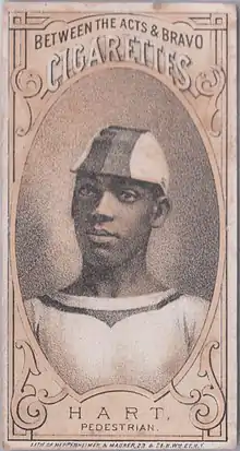 Born in 1857 or 1858 as Fred Hichborn (or a similar spelling), Hart immigrated to Boston from Haiti as a teenager and worked as a grocery store clerk before joining races to earn extra money.[1] [3] Frank Hart was chosen as his stage name, and he was variously also known as "The Negro Wonder" and "Black Dan", after his mentor and promoter Dan O'Leary.[1] While the sport of pedestrianism was short-lived in popularity, Hart was ultimately one of the first black sports celebrities in America.[4][5]